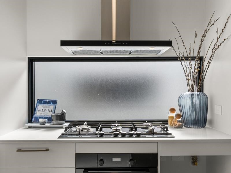• 900mm black glass gas cooktop with wok burner, cast trivets and range hood